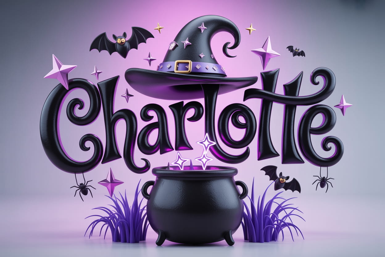 A conceptual artwork with the name "CHARLOTTE" in 3D lettering. The letters are black and have a whimsical touch. They are intricately adorned with purple accents, exuding elegance and luxury. Atop the name, a witch's black hat decorated with twinkling stars and diamonds adds a magical element. A cauldron below, filled with neon, silver stars, further emphasizes the enchanting theme. Bats and spiders.The composition is set against a spooky background, allowing the name and its embellishments to take center stage in this vibrant, graffiti-inspired render.