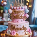 A 3D render of pink and silver heart-shaped balloons arranged in a decorative display. The word "YOUR TEXT" is spelled out in large pink letter-shaped balloons decorated with white daisies, pink roses, and green stems. The letter balloons are accompanied by five solid pink heart balloons and two heart-shaped balloons with a sparkly silver and white glitter pattern. The balloons are floating against a soft pink gradient background. The scene is illuminated by a warm pink light, creating subtle shadows on the reflective surface below. Small crystal-like decorative elements are scattered at the bottom of the image. The balloons are connected by thin gold strings that form a decorative base. The overall composition has a romantic, feminine aesthetic with a perfect balance of metallic, solid, and patterned balloons.