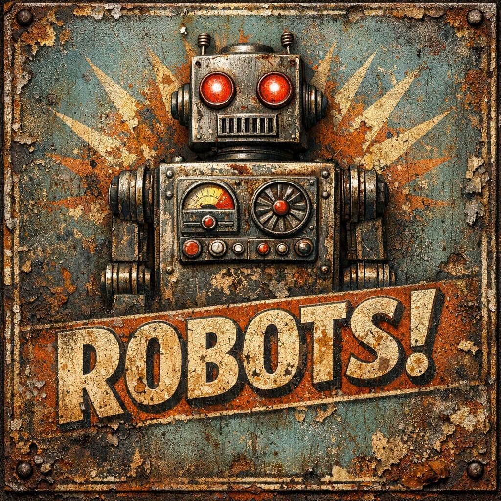 [SUBJECT]: a boxy 1960s toy robot with glowing red eyes and dials on its chest