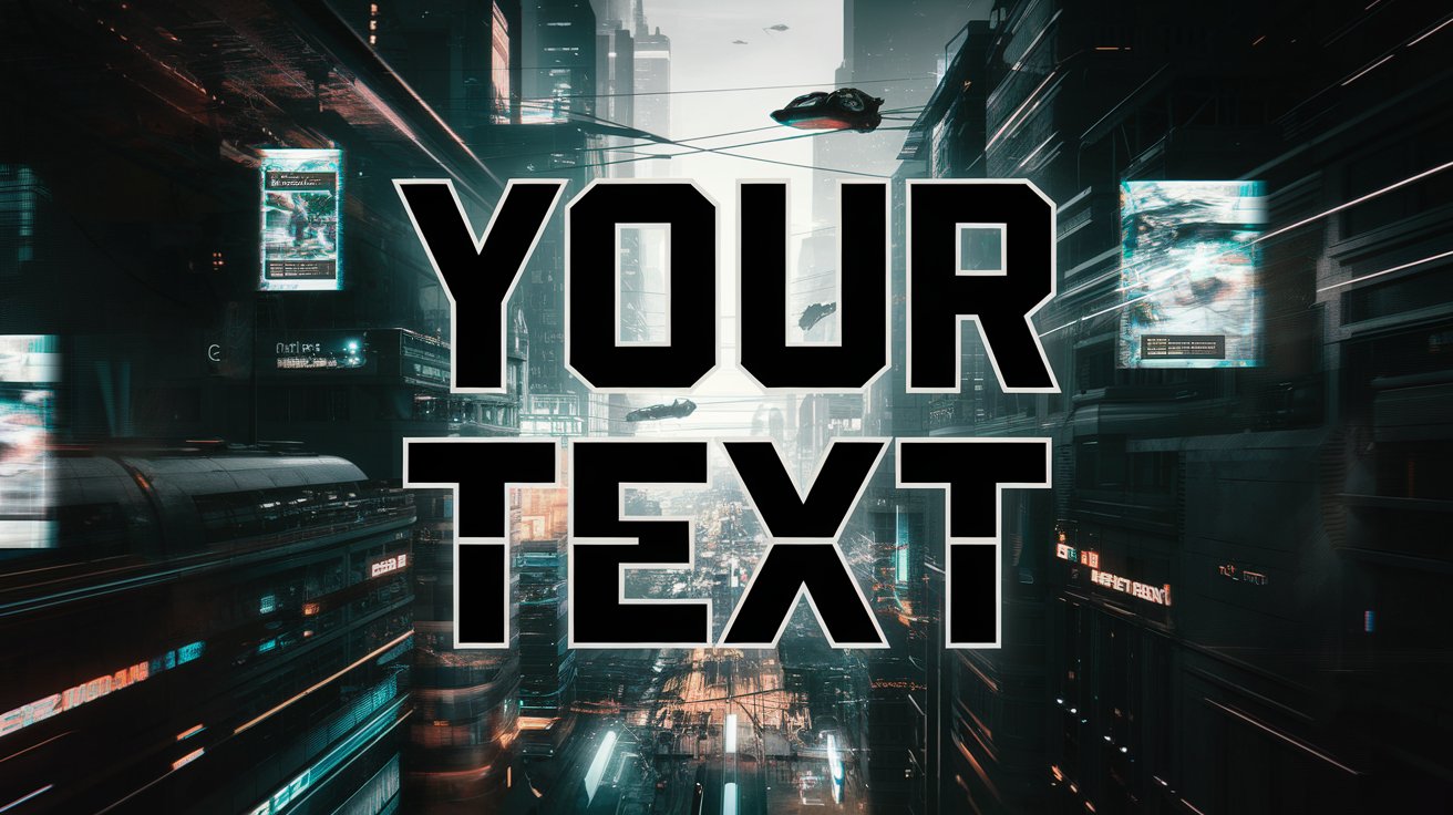 A cyberpunk-style image with the text "YOUR TEXT". The background is a futuristic city with tall buildings, neon lights, and flying vehicles. There are holographic advertisements floating in the air. The text is written in large, bold letters and is located in the middle of the image. The overall image has a dark tone.