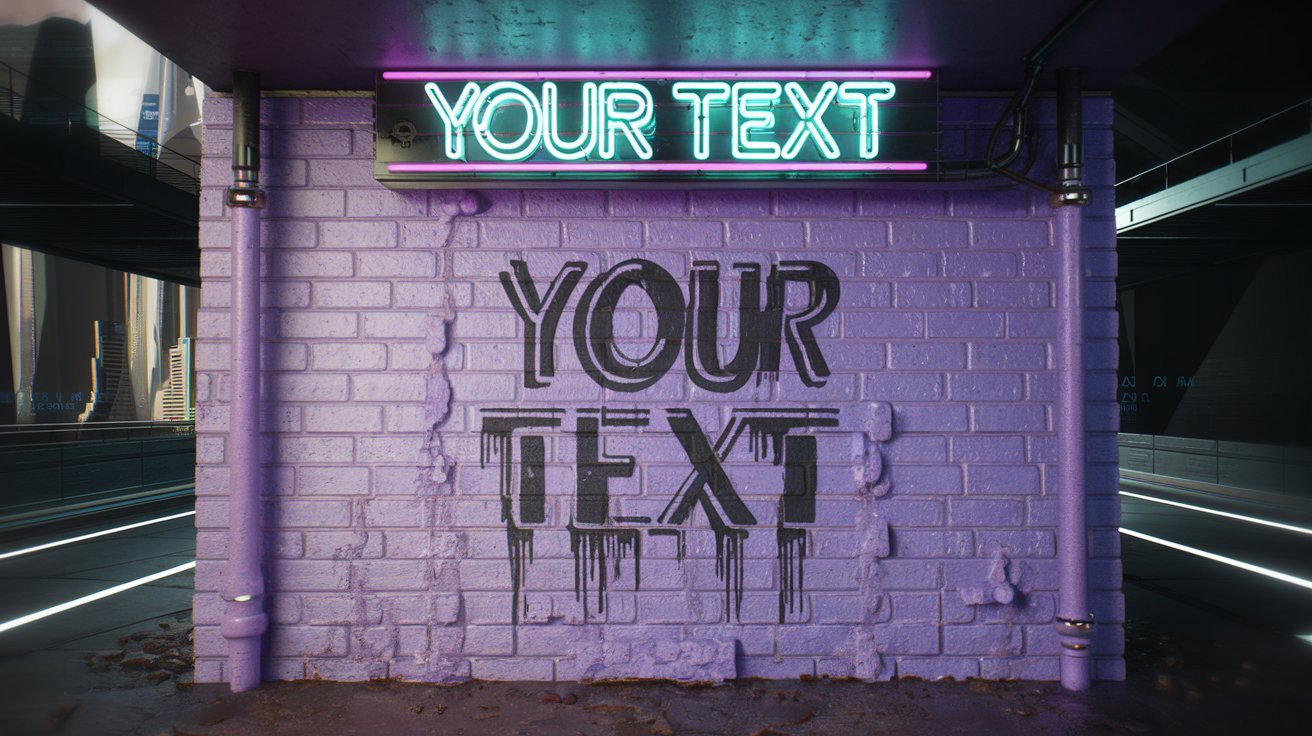 A 3D render of a cyberpunk-style scene with a brick wall painted in a soft purple hue. The wall has graffiti with the text "YOUR TEXT". There is a neon sign with the text above the wall. The background contains a futuristic city with tall buildings and a highway. The lighting is dark.