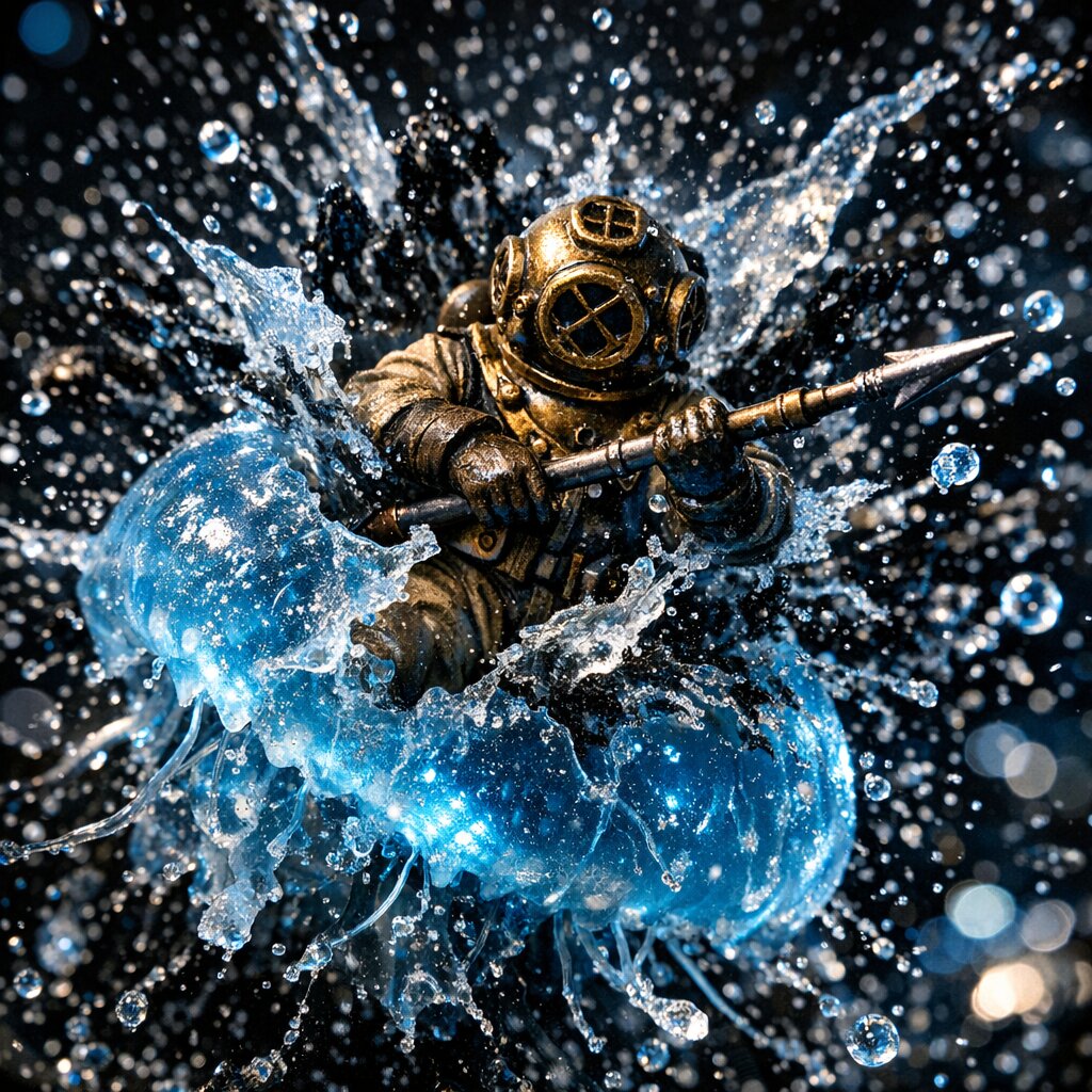 - [PARTICLES/LIQUID]: swirling ink-black water and glowing bioluminescent bubbles