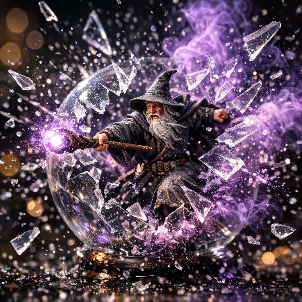 - [SUBJECT]: miniature fantasy wizard figure casting a spell with a wooden staff