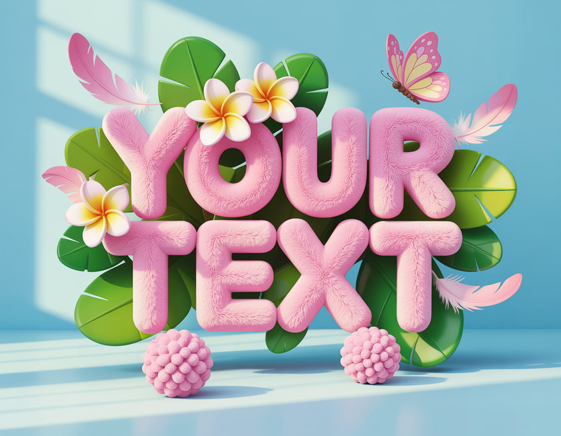 A vibrant 3D cartoon illustration of the text "YOUR TEXT" rendered in fluffy, rounded pink letters with a kawaii aesthetic. The letters are generously adorned with clusters of cute white and yellow frangipani flowers, large, cheerful green cartoon leaves, and soft pink feathers gently floating around them. Below the text, two soft pink pom-poms rest playfully, while a smiling pastel pink butterfly perches delicately on the top right corner of the composition. The scene is set against a clean, light blue background softly illuminated with gentle shadows, creating a bright and cheerful atmosphere perfect for a children’s poster.