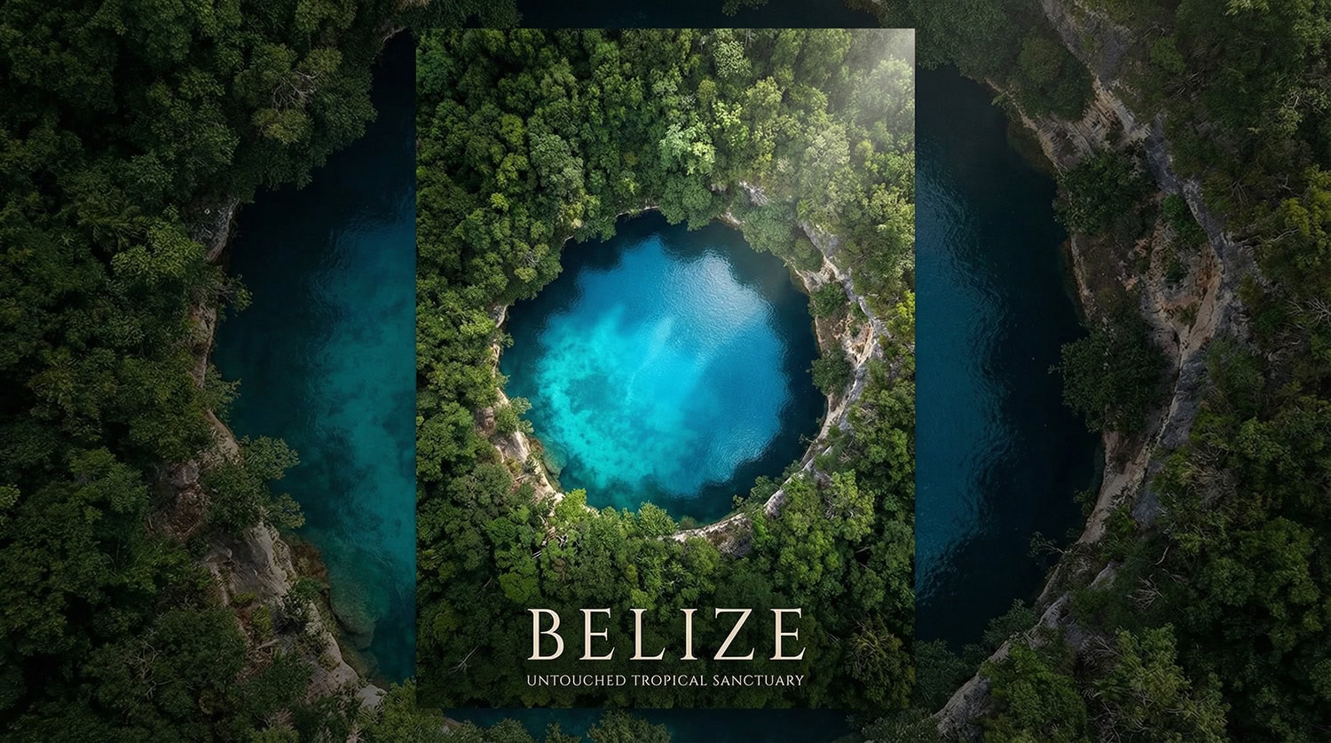 [SUBJECT]: a hidden tropical sinkhole with luminous blue water as the sole focal point, surrounded by dense untouched vegetation