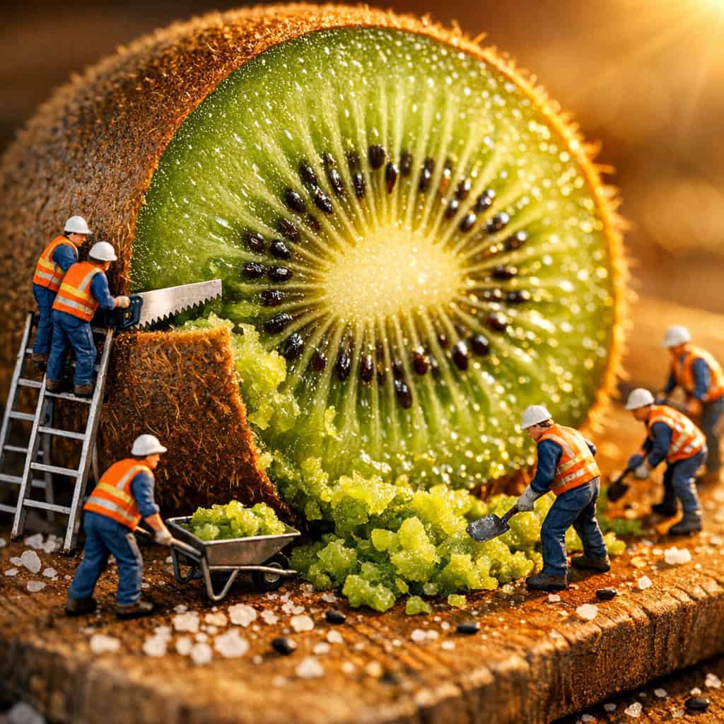 The visual impact comes from the extreme contrast in scale. You get to see the glistening textures of fruit pulp and the rugged terrain of rinds in incredible detail, while the presence of the tiny figures gives the image a sense of story and industry. It is a fantastic style for food advertising, social media content, or just making someone smile at the absurdity of a construction crew sawing through a kiwi.