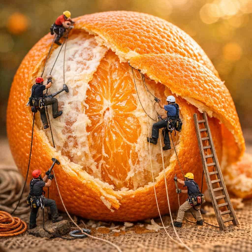 [SPECIFIC_ACTION]: Rappelling down the side of the fruit while pulling back the thick skin with ropes