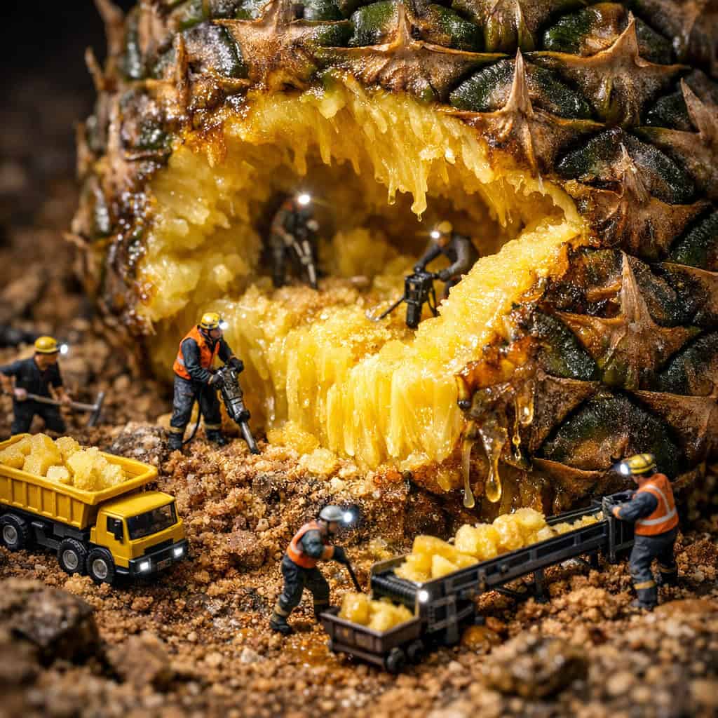 Have you ever looked at a slice of fruit and imagined it was a giant landscape waiting to be explored? This creative prompt style takes that childhood wonder and turns it into high definition digital art. By combining the aesthetics of macro photography with the charm of miniature model dioramas, you can create scenes where tiny construction workers, miners, and chefs are hard at work processing everyday produce.