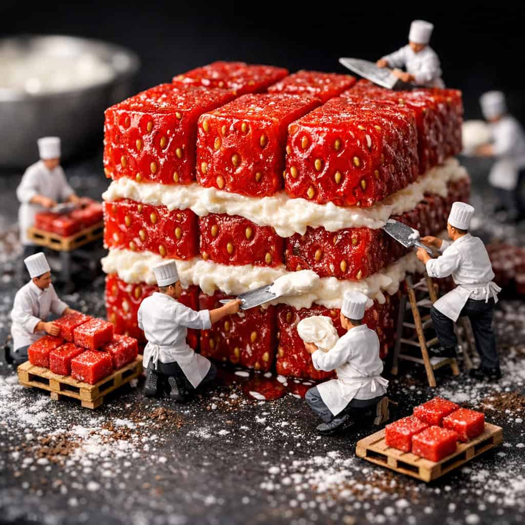 [SUBJECT]: A giant ripe strawberry being sliced into precise cubes and layered with cream