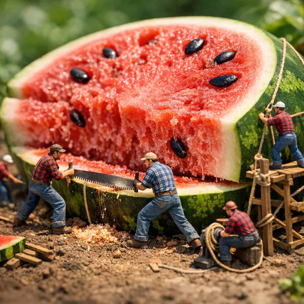 - Scale Adjustments: To make the fruit look even bigger, describe the workers as “microscopic” or “nano scale” to exaggerate the size difference.