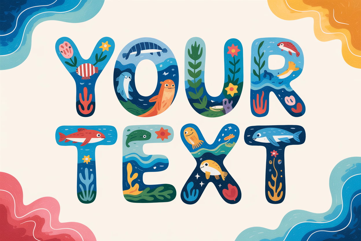 Create a whimsical paper collage of the word "YOUR TEXT" in a playful, childlike style. Incorporate a variety of friendly marine animals and utilize a vibrant palette of blue hues with subtle tonal variations. Ensure a handcrafted, textured aesthetic.