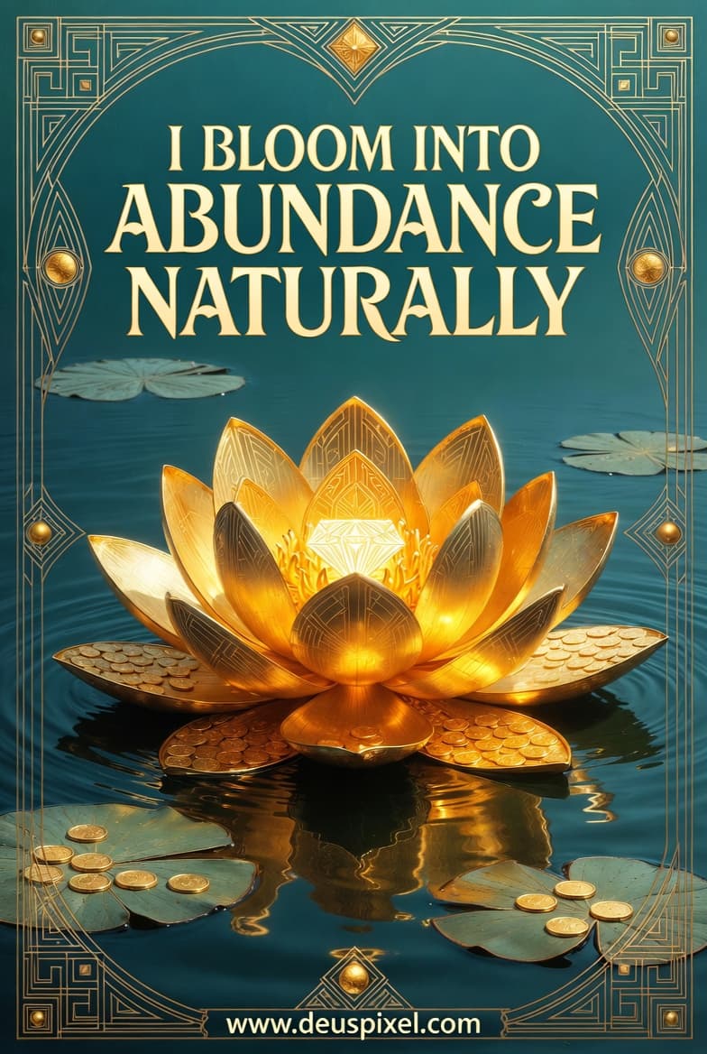 Sacred golden lotus flower in full bloom floating above calm water surface, each petal designed with Art Deco geometric patterns, center of lotus holds glowing diamond, petals gradually transforming into gold coins at edges, lily pads made of gold coins, rich teal and gold palette, ornate border with Eastern-meets-Deco fusion motifs, bold text 'I BLOOM INTO ABUNDANCE NATURALLY', decorative elements, bottom text: www.deuspixel.com – spiritual elegance, photorealistic water reflections, serene atmosphere, symbolic beauty, 4K resolution