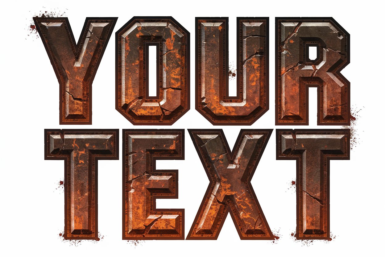 Create a logo with the text 'YOUR TEXT' styled in a rugged, rusted metal design. Each letter should appear aged, with a distressed, corroded iron texture, featuring visible cracks, scratches, and patches of orange-brown rust. Use a bold and slightly uneven font to reflect a survival theme. Set the background to solid white for PNG format, making the text visually prominent and clean. Add subtle details like small dirt splatters or decay around the edges of the text to enhance the survival game aesthetic.