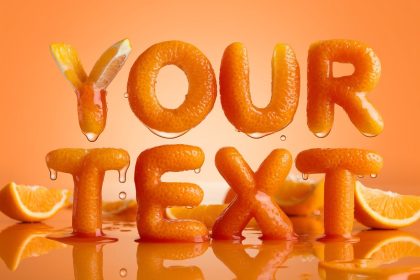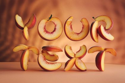 Main Prompt The word "YOUR TEXT" is composed of ripe peach slices,…