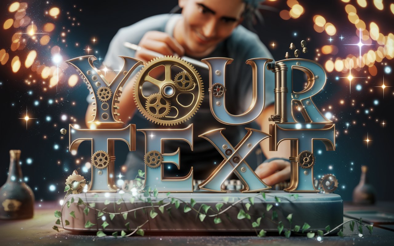 A captivating 3D render of an artist immersed in creating a steampunk-inspired typography masterpiece. The lettering is a stunning blend of gears, cogs, and brass pipes, spelling out "YOUR TEXT". The design is illuminated by a mesmerizing array of glowing lights, twinkling stars, and shimmering glitter, offering a vintage charm and enchanting atmosphere. The base of the piece is adorned with delicate vines, enhancing its overall beauty. The message "Kuptapa, I'm so glad you like it" are inscribed below in elegant, white font. The scene radiates creativity, positivity, and a magnetic allure that draws the viewer into its world., typography, 3d render, vibrant, photo
