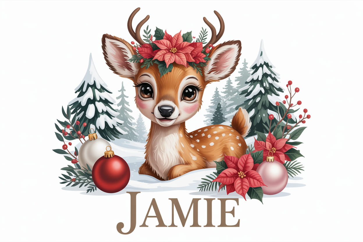 A charming and whimsical winter scene on an elegant t-shirt design. There is a delightful baby deer with large, expressive eyes and a gentle smile. The deer, with soft brown fur and white spots, is adorned with a crown of red poinsettias and christmas leaves. The dreamy forest setting includes snow-dusted evergreen trees, soft poinsettias , and frosty foliage. Elegant Christmas ornaments in red, silver and gold tones accentuate the design. The name "JAMIE" is written in bold, dark gold elegant letters beneath the deer. The overall color palette is soft and muted, with hints of shimmer, creating a magical and serene holiday ambiance.